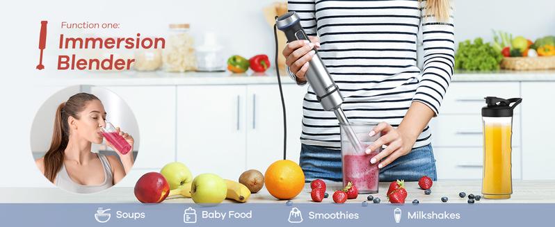 8 in 1 Hand Blender Includs Puree masher, Egg Beaters, 800ml Mixing Beaker, 600ml Chopper, Whisk,Milk Frother, Hand Blender and 600ml Sport Cup